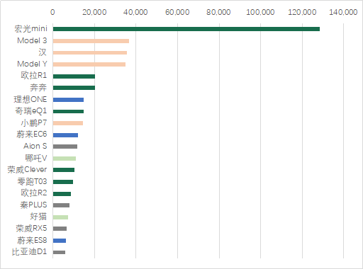 而这17款BEV车型中,A级车型只有两款,即广汽埃安的Aion S和比亚迪D1(参数|图片),而且这两款车型都是主打出行/出租市场。其他15款车型以私人消费市场为主。这15款BEV车型中,A00车型有7款,接近一半左右,分别是五菱宏光MiniEV(参数|图片),长城欧拉(参数|图片)R1(黑猫)、长安奔奔、奇瑞eQ1、荣威Clever、零跑T03、欧拉R2(白猫); B级及以上车型有6款,分别是特斯拉Model3、Model Y,比亚迪汉、小鹏P7、蔚来EC6和ES8;A0车型两款,即哪吒V和欧拉好猫。