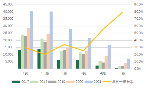 一是面向私人消费的新能源汽车销售比例大幅上升,从2019年的46%上升到了当前的77.5%;一是除去限牌限购城市之外,一线到五线城市,新能源汽车的销量都实现了大幅增长。特别是四线和五线城市,从2017年至2020年,新能源汽车的年均复合增长率分别达到了55%和79%。这说明新能源汽车的消费正在从限牌限购城市向低线城市渗透。